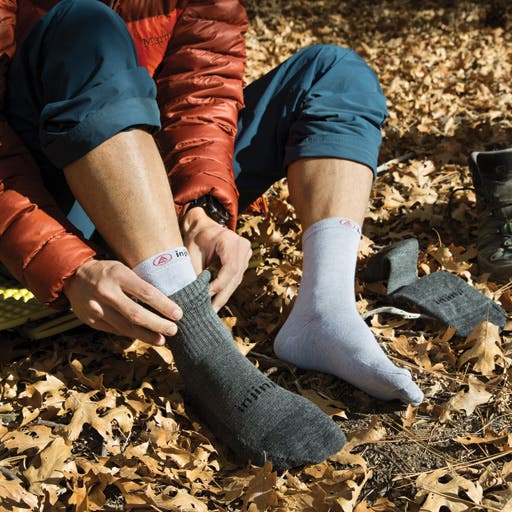 Hikers often wear a thin, baselayer sock, like the Liner Crew, under a thicker, cushioned hiking sock for blister prevention, comfort and warmth.