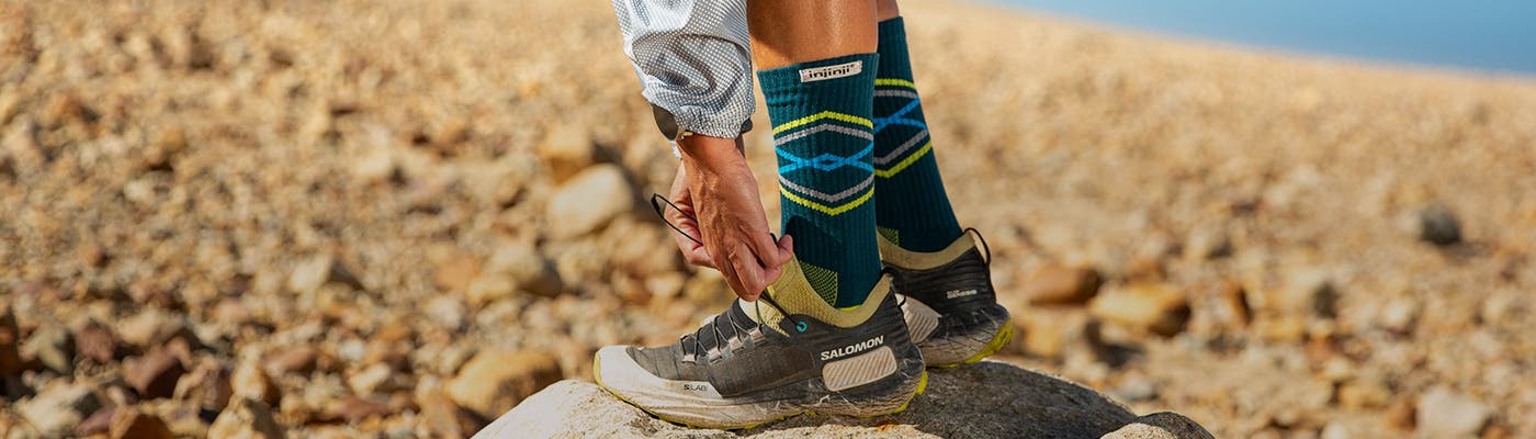 Run and hike on technical terrain in cushioned trail socks that seal out debris.